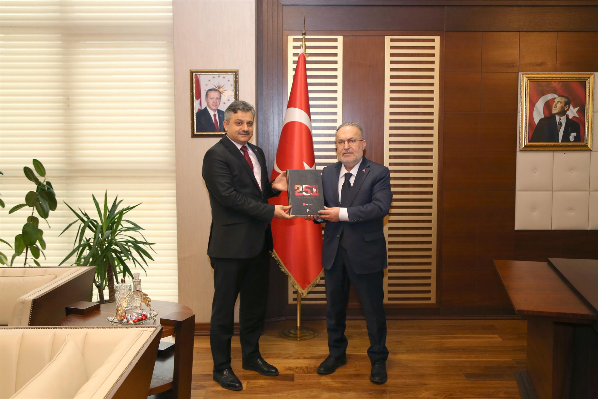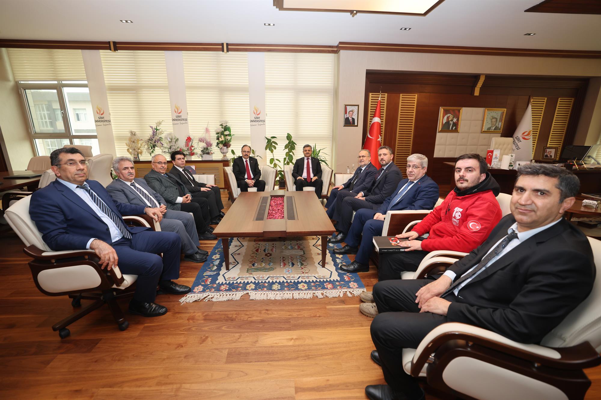 Rektörümüz Prof. Dr. Nihat Şındak, Siirt Valisi ve Belediye Başkan Vekili Dr. Kemal Kızılkaya, Şirvan Kaymakamı Ahmet Ali Altıntaş ve 15 Temmuz Derneği Başkanı İsmail Hakkı Turunç ile beraberindeki heyeti rektörlük makamında ağırladı.